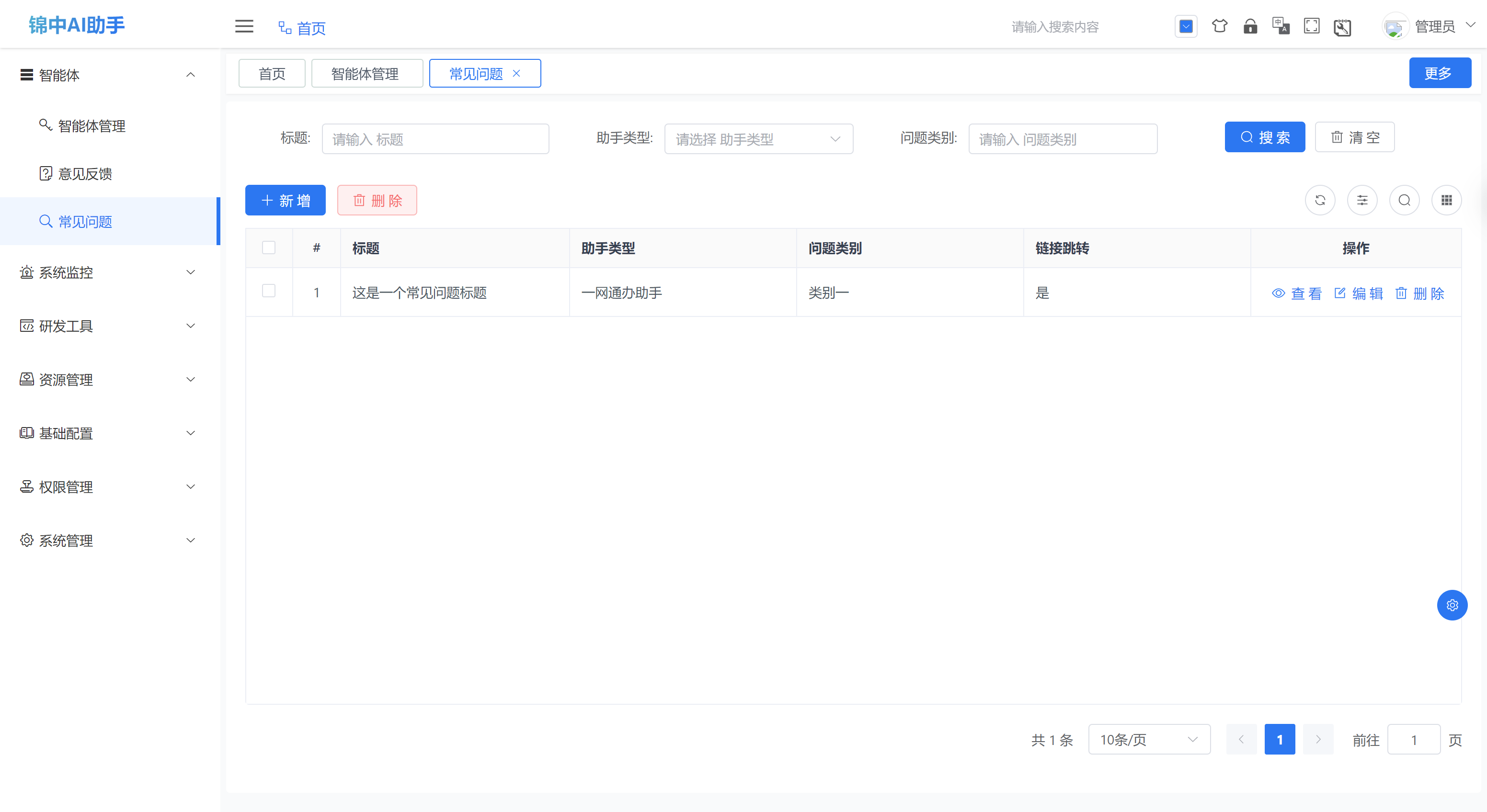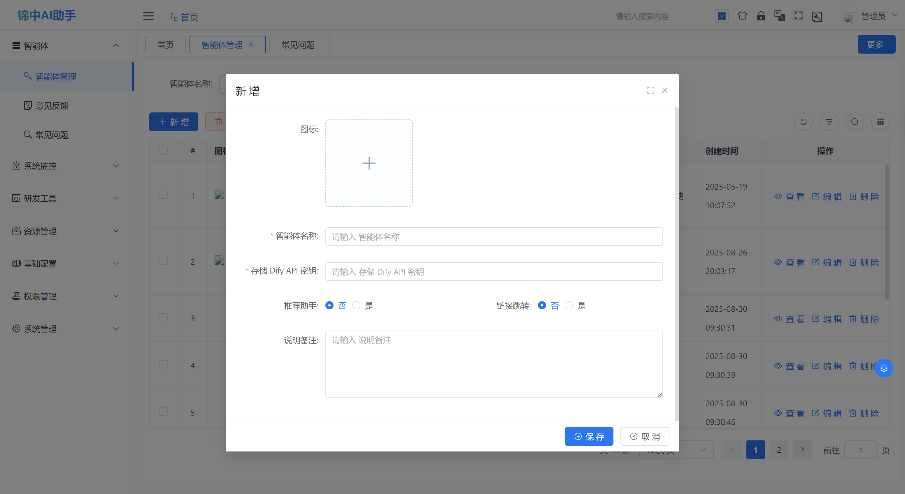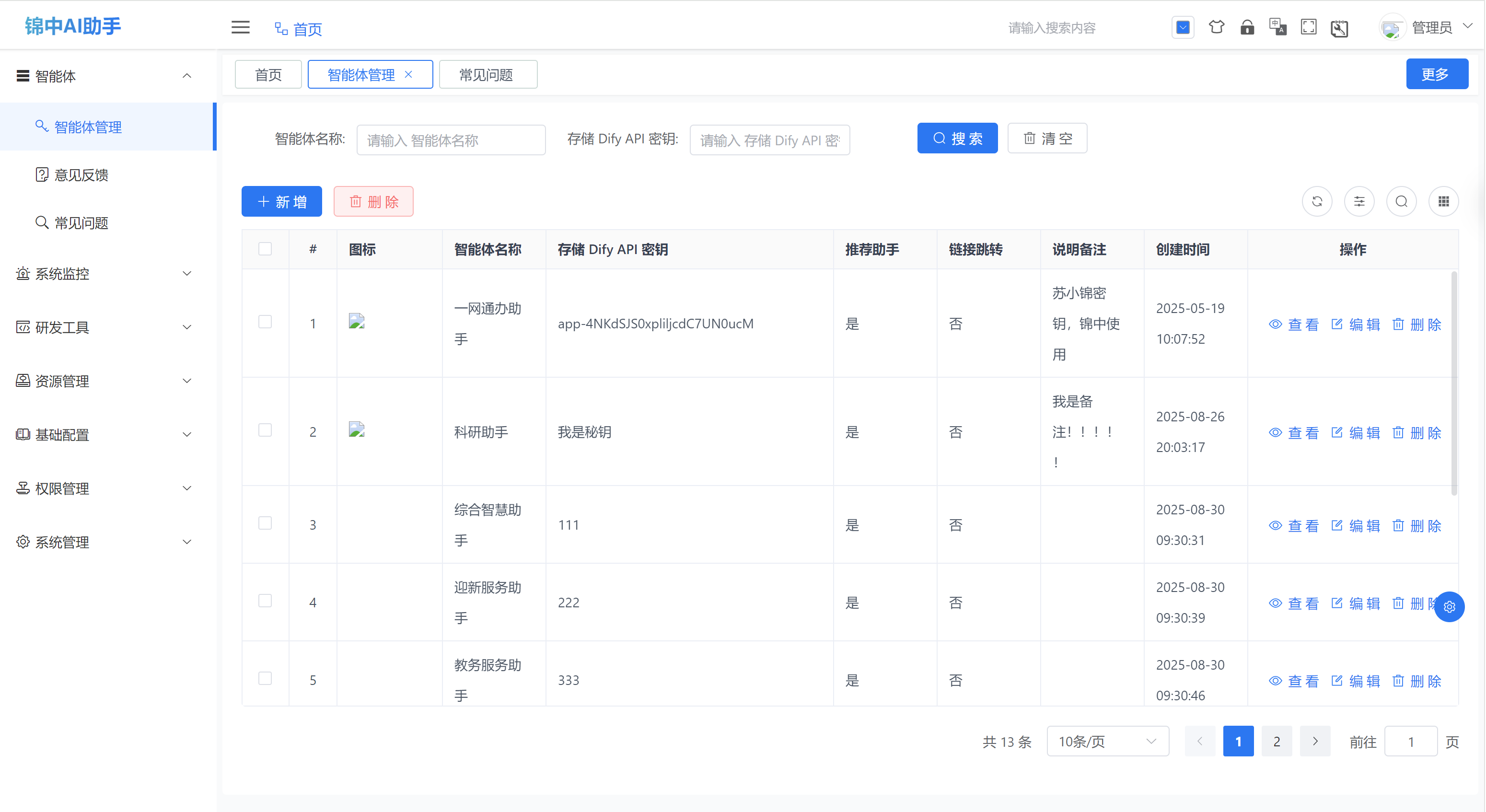 管理端主要面向少数人使用,功能包括:用户信息管理、智能体信息录入、智能体常见问题维护,以及查看和处理用户意见反馈。 登录账号admin 密码 admin  ### 智能体管理 智能体管理页面主要用于配置智能体相关信息。密钥需从 Dify 平台获取;可选择是否设为推荐助手,若勾选,则会在对话界面的推荐助手区域展示;“链接跳转”字段用于配置友情链接。完成配置后,智能体将展示在用户端的“探索”模块中。   ### 常见问题管理 常见问题管理用于录入问题分类及对应的常见问题。每个智能体都对应一个常见问题集,常见问题既可以直接录入问题与答案,也可以配置为一个跳转链接,用户点击后可直接跳转到指定页面。   ### 意见反馈管理 意见反馈管理主要用于查看用户提交的反馈意见。  ### 用户管理 用户管理主要用于管理用户信息,包括用户权限配置、密码重置、用户信息等等