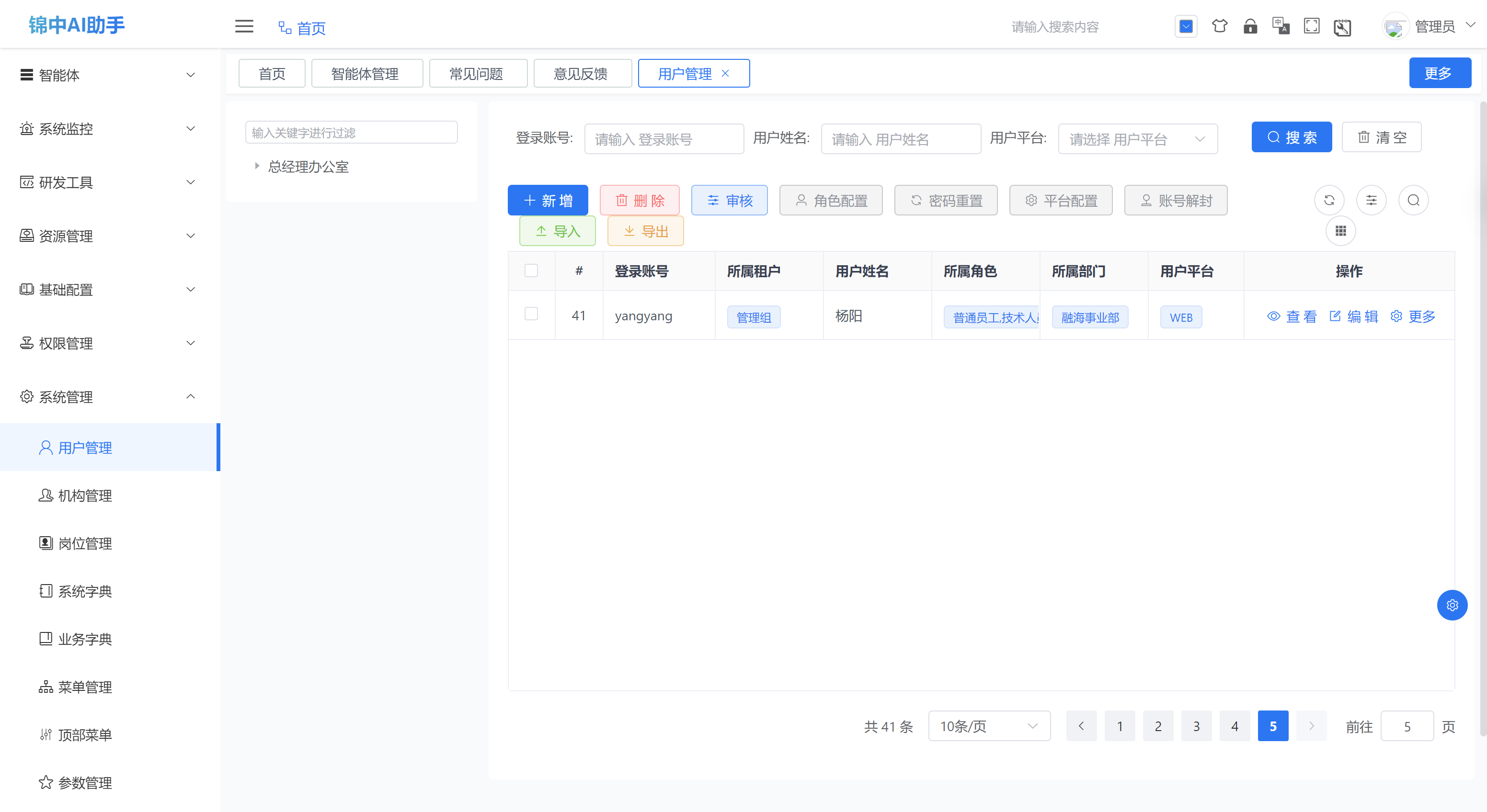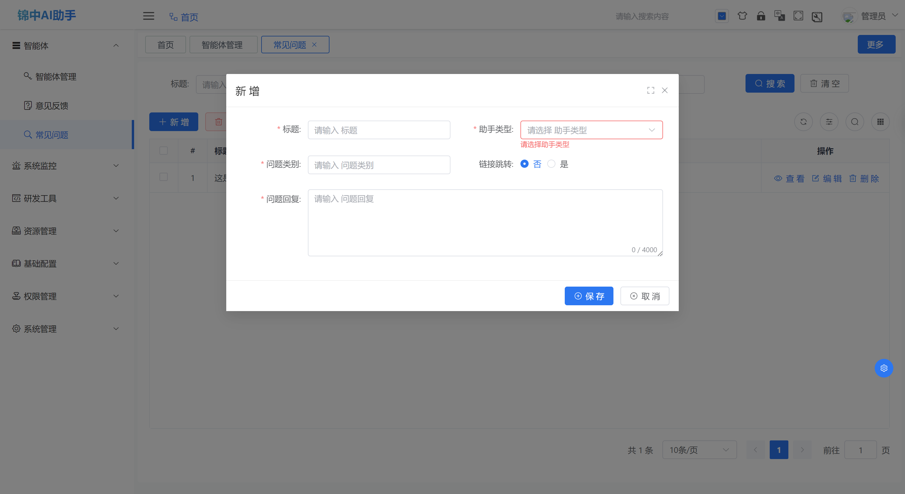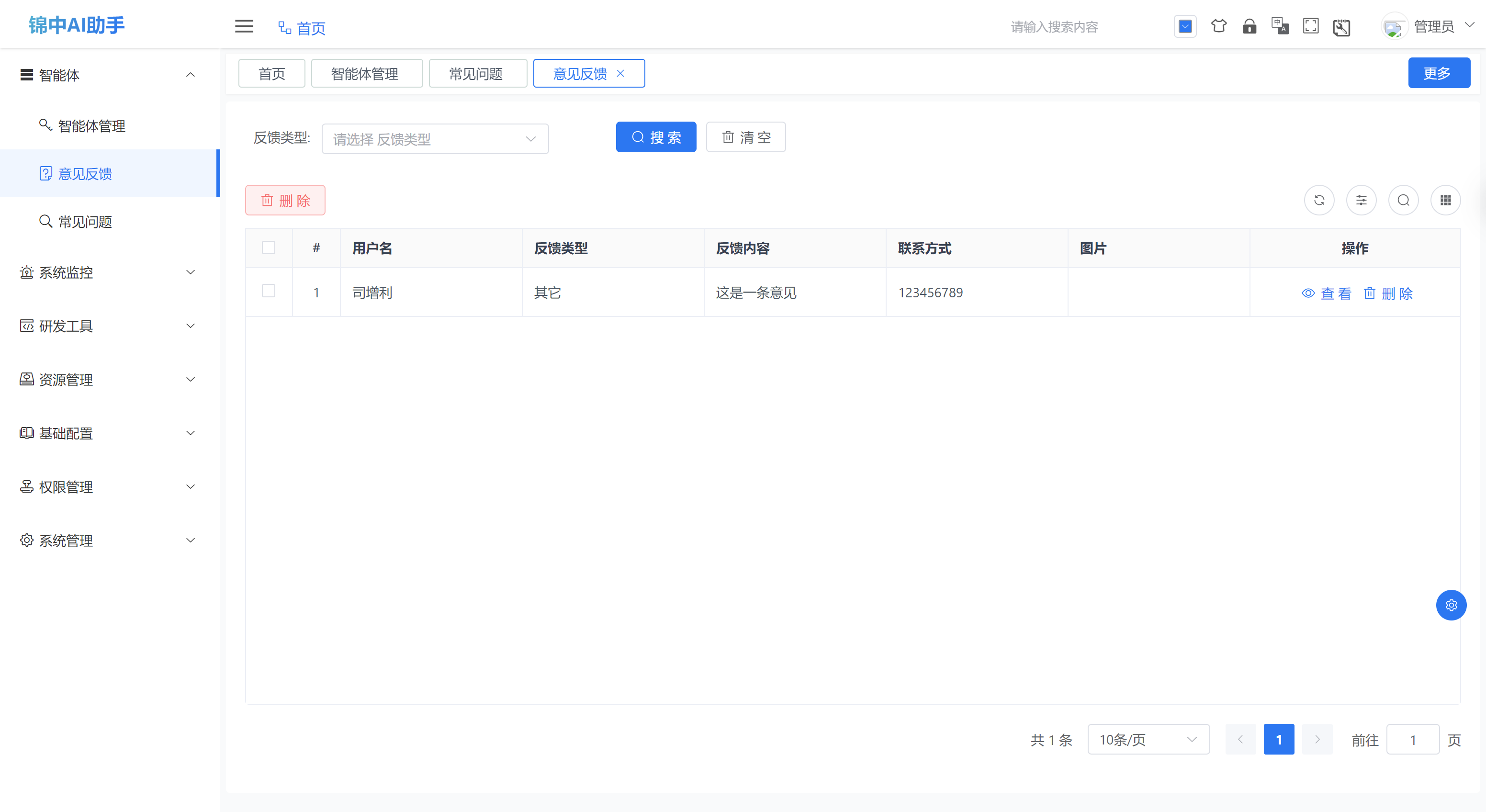 管理端主要面向少数人使用,功能包括:用户信息管理、智能体信息录入、智能体常见问题维护,以及查看和处理用户意见反馈。 登录账号admin 密码 admin  ### 智能体管理 智能体管理页面主要用于配置智能体相关信息。密钥需从 Dify 平台获取;可选择是否设为推荐助手,若勾选,则会在对话界面的推荐助手区域展示;“链接跳转”字段用于配置友情链接。完成配置后,智能体将展示在用户端的“探索”模块中。   ### 常见问题管理 常见问题管理用于录入问题分类及对应的常见问题。每个智能体都对应一个常见问题集,常见问题既可以直接录入问题与答案,也可以配置为一个跳转链接,用户点击后可直接跳转到指定页面。   ### 意见反馈管理 意见反馈管理主要用于查看用户提交的反馈意见。  ### 用户管理 用户管理主要用于管理用户信息,包括用户权限配置、密码重置、用户信息等等