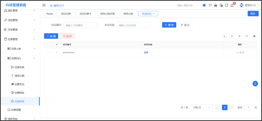 ## 支出科目 主要是为了经费支出表单中支出类型提供下拉选择,其中的“绩效”是默认的,提供信息。