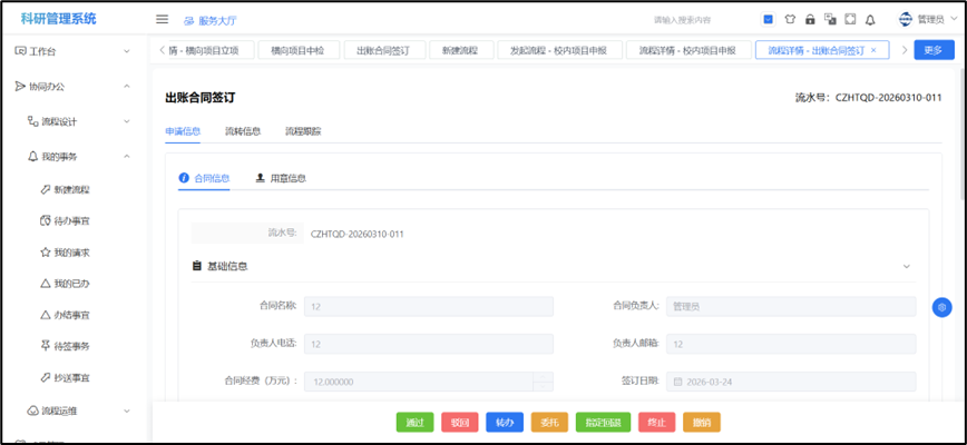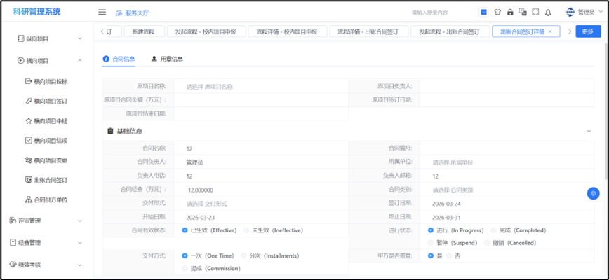 ## 出账合同签订 登录PC端选择服务大厅->事务办理->更多->出账合同签订,点击此界面的发起,选择需要签订的的项目,核对信息,填写签订信息,用章信息,点击“提交”,指定审批人可以在待办事务中查看到申请信息。  出账合同签订提交流程之后,可以在待办事项和我的请求中查看,流程信息和流程状态。  出账合同签订通过之后,可以在项目管理->横向项目->出账合同签订查看项目信息,点击详情可以查看填报的信息并且进行新增修改,并且也可以对数据进行导出功能。 该页面提供对出账合同签订的基本搜索。点击“合同名称”后能查看横向项目变更的相关数据。