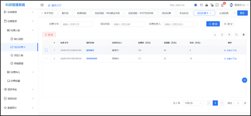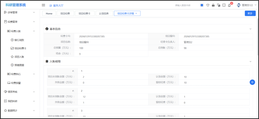 ## 项目经费卡 一个项目有一个项目经费卡,项目经费卡的负责人就是项目负责人,可以点击“项目名称”查看项目经费的一些入账内容和经费支出信息,后续中经费外拨、经费结转、绩效分割都是根据项目经费卡内容进行分配。