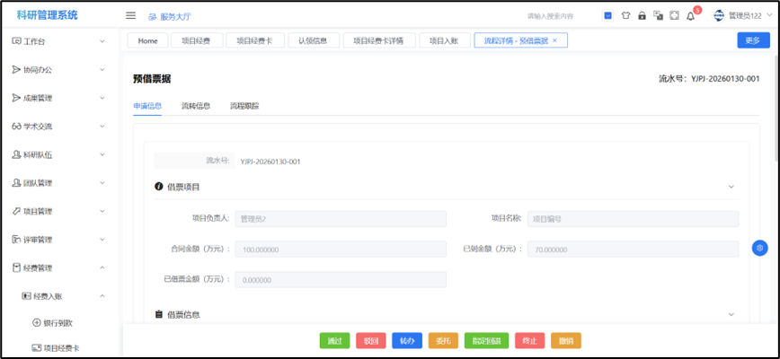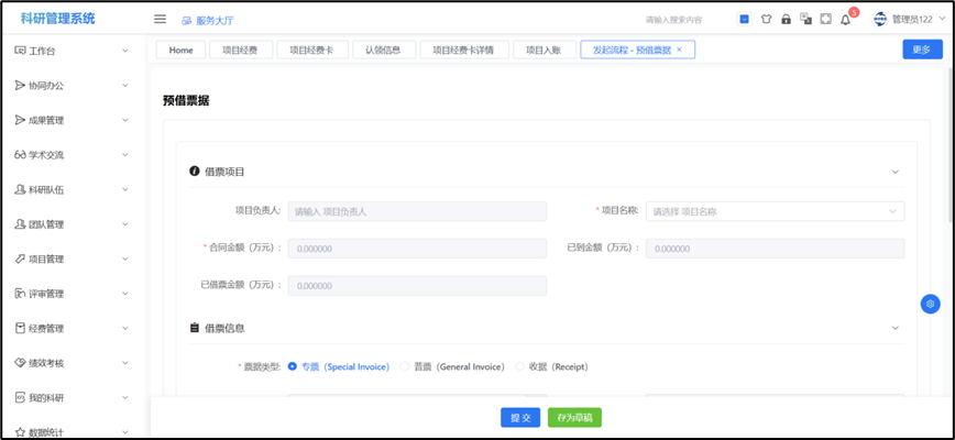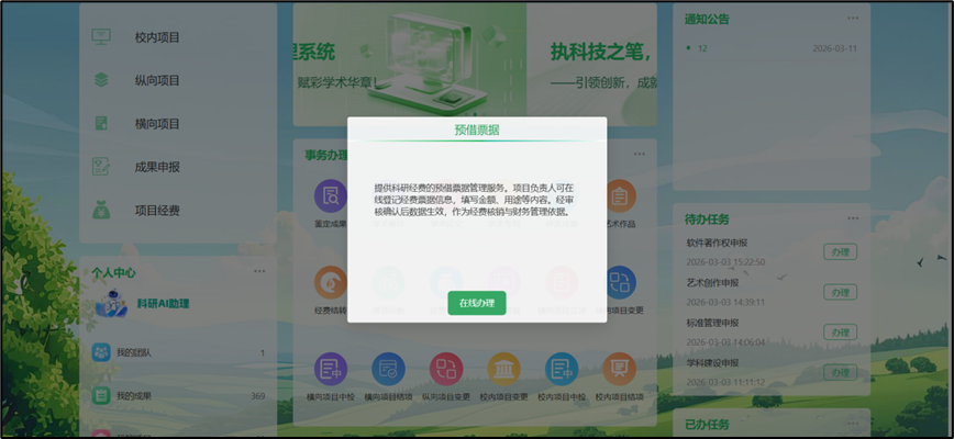 ## 预借票据 (1)办理预借票据的项目已完成立项(科研系统可查到且有项目编号); (2)申请人为项目负责人。  在科研系统首页服务大厅【事务办理】,点击服务点名片【预借票据】。进入欢迎页,仔细阅读流程说明、注意事项等。阅读并同意后,点击【立即办理】,进入预借票据表单。