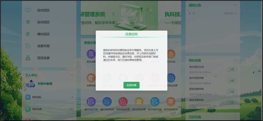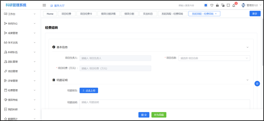 ## 经费结转 登录PC端选择服务大厅->事务办理->经费结转,点击此界面的发起,选择需要经费结转的项目,核对信息,填写经费结转信息,选择指定审批人,点击“提交”,指定审批人可以在待办事务中查看到申请信息。