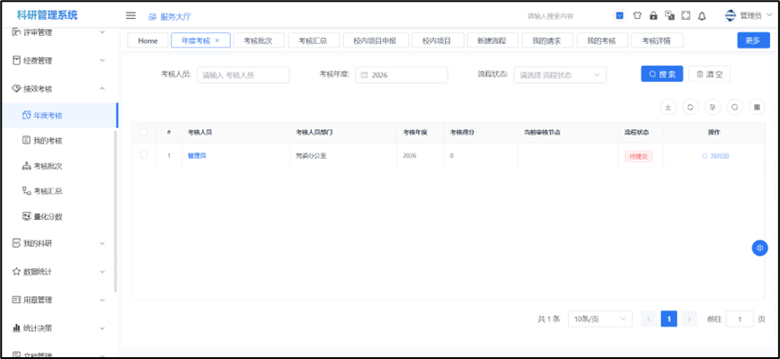 ## 年度考核 在考核批次中点击生成即可生成对应的年度考核,用户可以在当前页面看到对应的年度的考核分数、流程状态,点击“考核人员”进入到个人考核的详细页面
