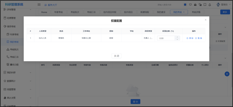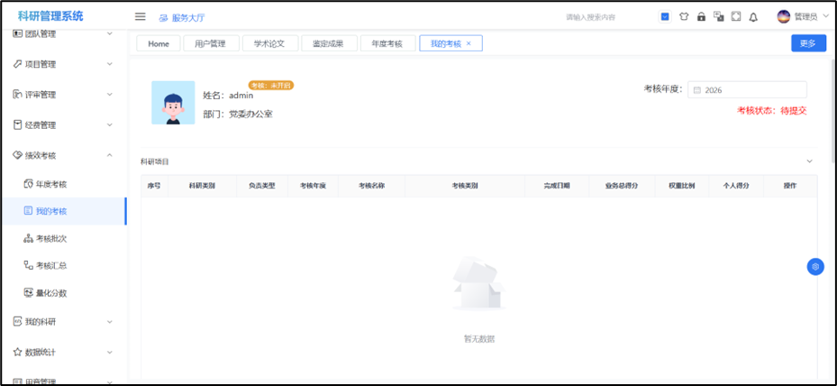 ## 我的考核 我的考核模块作为核心展示入口,将集中呈现当前登录用户的全部详细考核信息,实现考核数据一站式查看,核心涵盖科研成果、科研项目、科研经费三大类核心科研考核指标,所有信息按规范分类排版、层次清晰,便于用户核对自身考核数据及管理员开展考核审核工作。 模块支持对科研成果、科研项目、科研经费三大核心考核指标进行灵活的权重比例设置。管理员可根据不同业务类型、岗位差异、考核周期要求,自主调整各考核指标的分值占比。 用户确认考核信息无误后,点击模块中的“提交”按钮,自动保存。整个计算过程无需人工干预,有效减少人工计算的误差,提升考核工作的效率,提交后可直接查看最终考核结果。